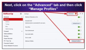 After that, in the antivirus settings I had to go into Advanced Tab and click on Manage Profiles.