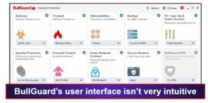 BullGuard has a less appealing user interface – it packs many functions into a small space and conceals important settings behind multiple drop down menus.
