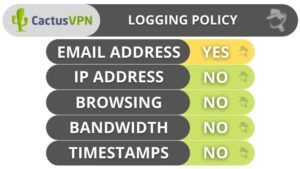 • CactusVPN has no logs policy . CactusVPN will not log traffic history or personal data.