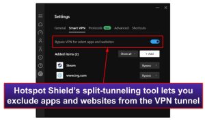 Hotspot Shield is a Windows program that allows you to exclude websites and apps. It’s easy to use. You can choose which sites and apps you want to bypass the VPN tunnel, unlike Android.