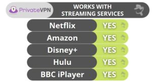PrivateVPN works with Netflix Prime, Amazon Prime, and Disney+. PrivateVPN also works with Hulu iPlayer, and Netflix Prime.