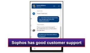 Sophos’s customer service department is excellent. I had a great chat with the agent. I received a prompt and informative response to my email inquiry.